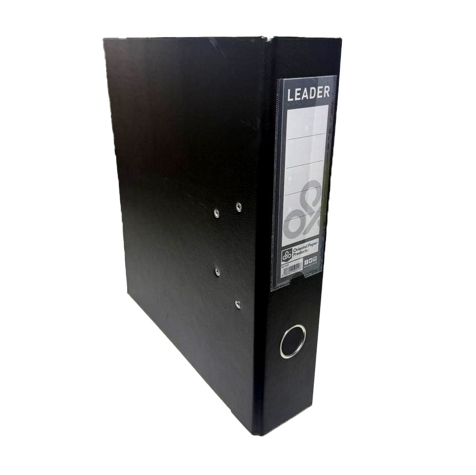 A4-size lever arch file .It features a sturdy metal clamp, a finger ring for easy retrieval, and a labeled spine for quick identification. With its black marbled finish, it's ideal for professional, academic, or home organization.