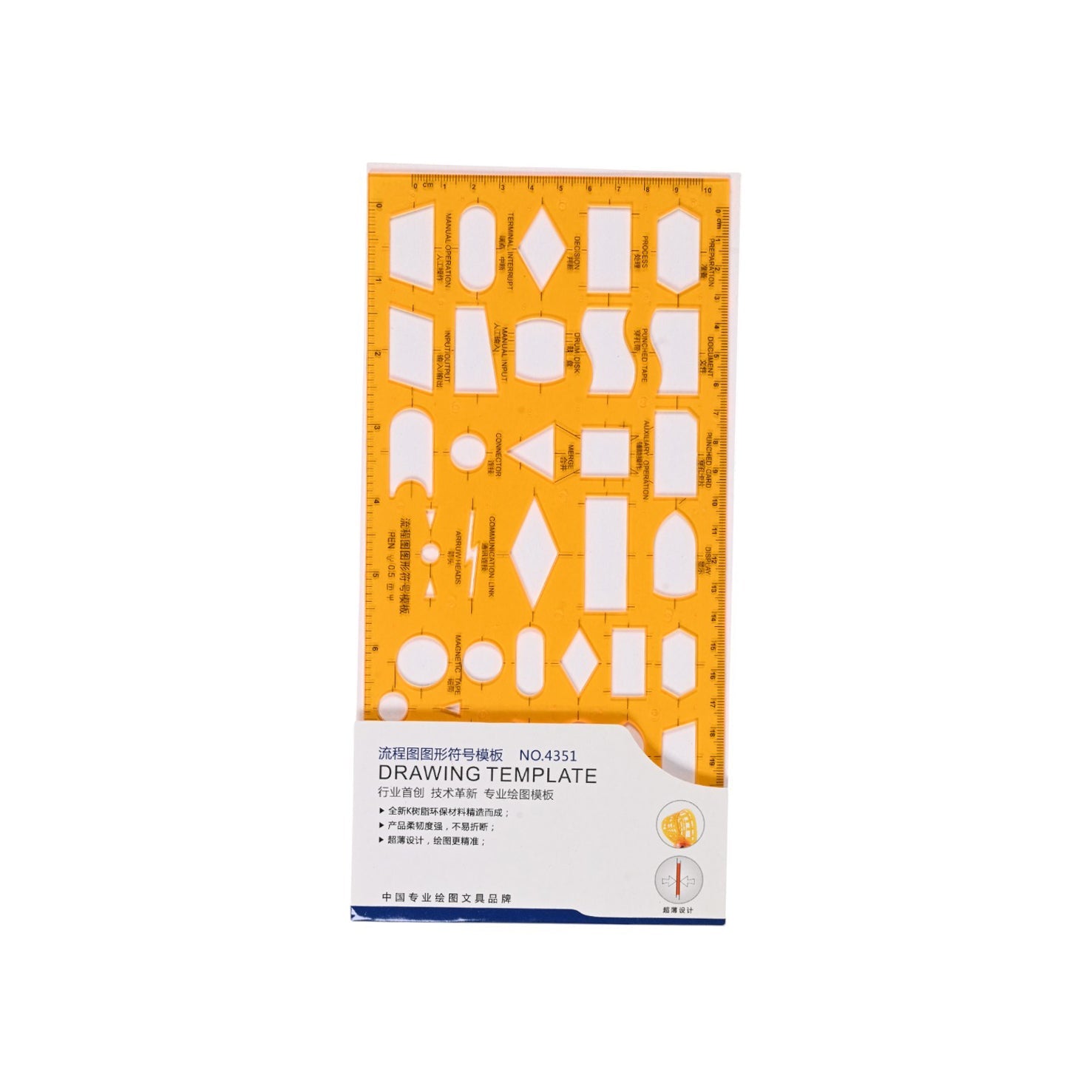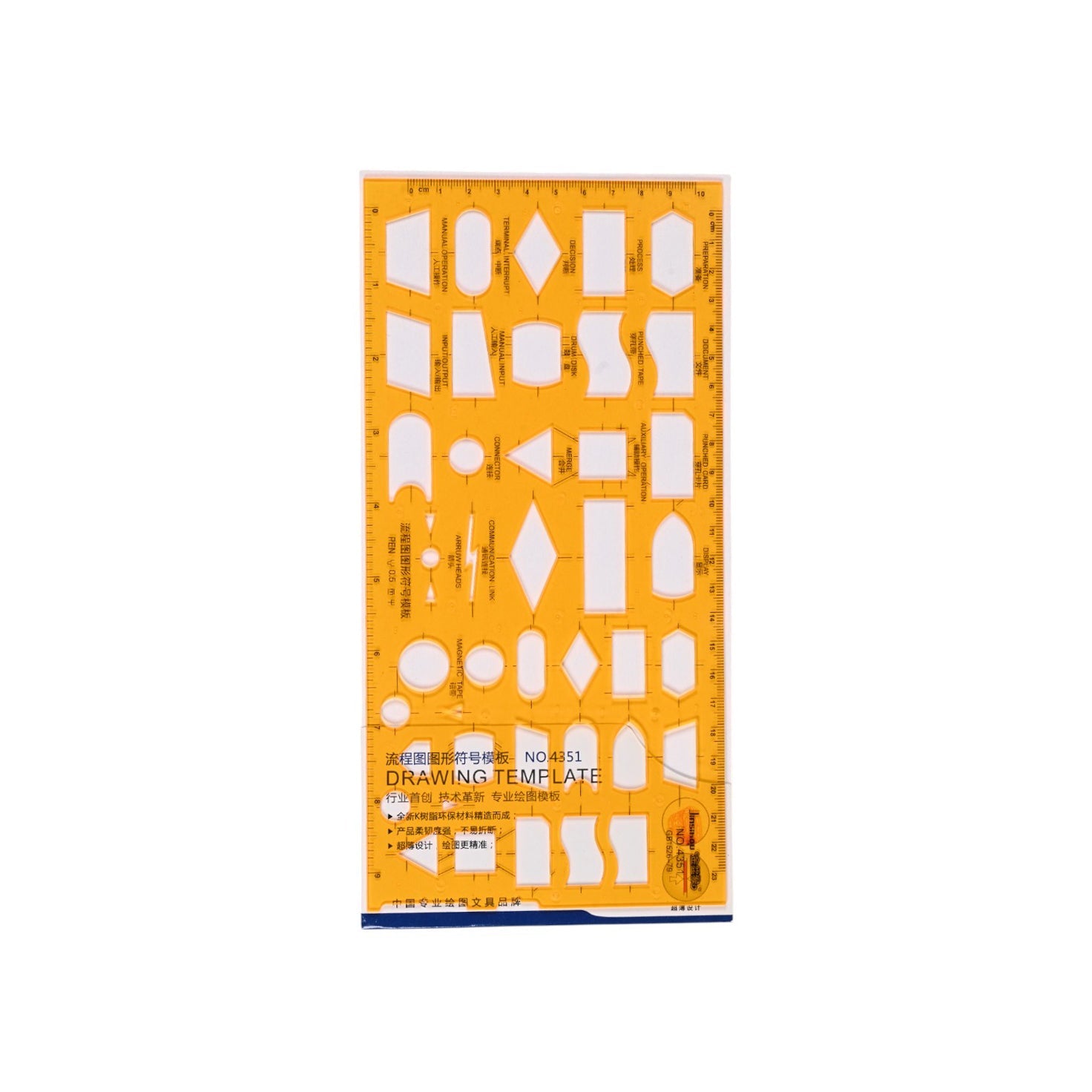 it features clearly labeled cut-outs including standard flowchart symbols like process, decision, document, connector, and more. It also includes rulers on the sides for accurate measurements.