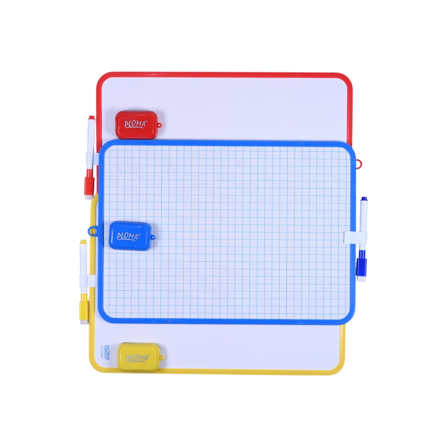 Features a ruled side for structured writing and a plain side for freehand drawing or notes. Ideal for students and home learning, it includes a marker and eraser.