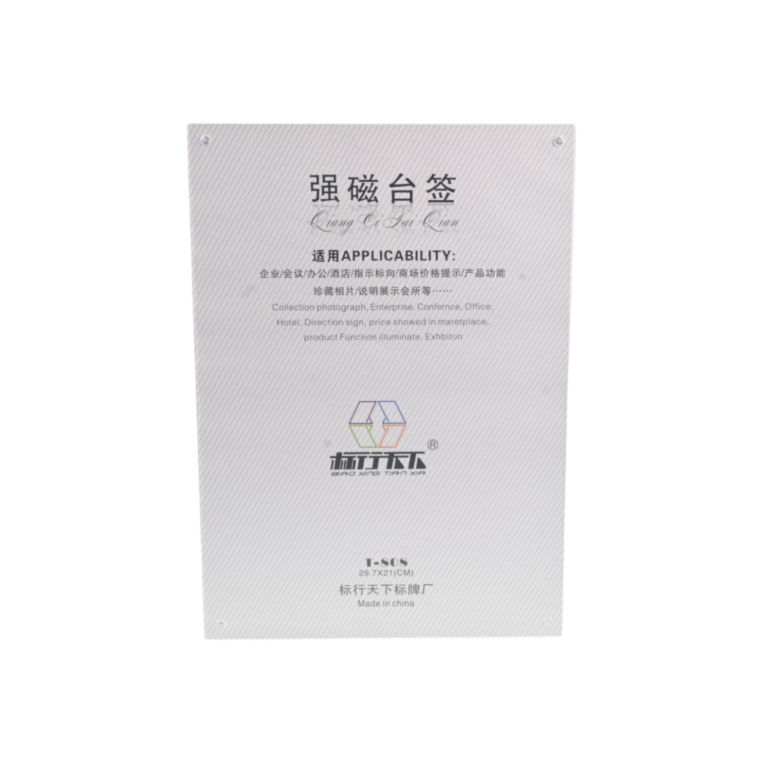 Designed in a clear portrait orientation, it features two crystal-clear panels held together by strong magnets and corner screws. Simply slide your insert between the panels for a clean, professional display.